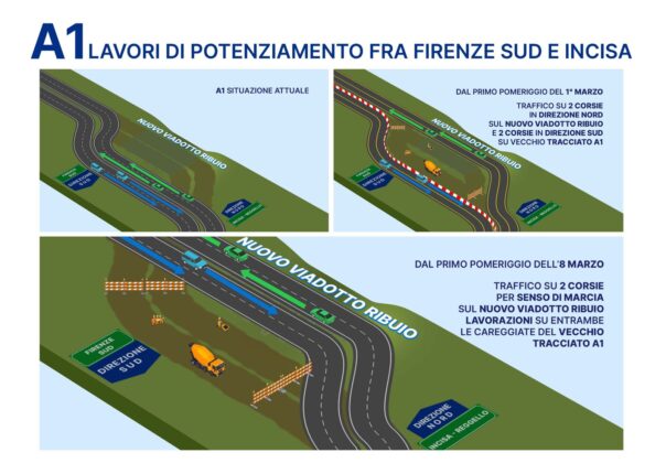 ROMA – Sull’autostrada A1 Milano-Napoli, nel tratto tra Firenze sud e Incisa Reggello, nell’ambito dei lavori di ampliamento alla terza corsia, è prevista nel fine settimana dal 27 febbraio al 1 marzo 2026 la prima fase delle operazioni di apertura al traffico del nuovo viadotto “Ribuio”.